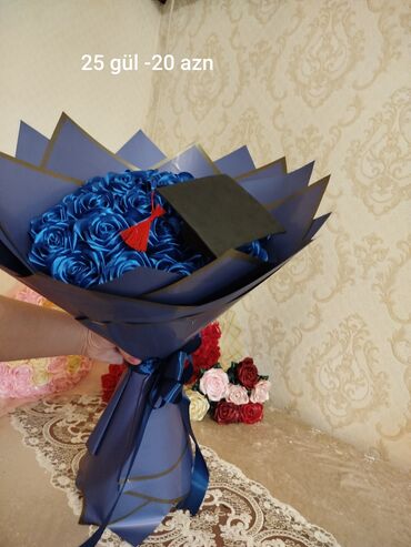 Tünd mavi rəng tonlarında hazırlanmış dekorativ gül dəstəsi. - Parıltılı, məxməri effektli süni qızılgüllərdən ibarət kompozisiya - Aralara uyğun tonlarda mavi bəzək qönçələri əlavə olunub - Qara r...