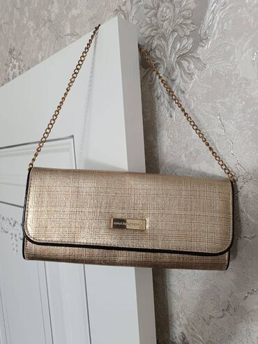 Zərif axşam çantası (klatç) - Rəng: şampan/qızılı tonlarında parlaq tekstura - Forma: qeyri-adi çoxbucaqlı dizayn, sərt korpus - Material: parıltılı toxumalı parça, qızılı tonlu metal çərçivə - Ba...