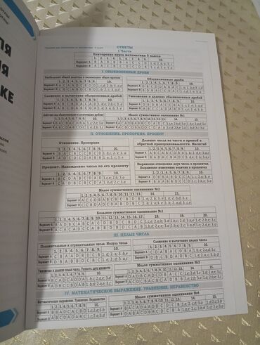 - Bölmələr: kəsrlər, münasibət/proporsiya/faiz, tam ədədlər, riyazi ifadələr, tənlik və bərabərsizliklər, həndəsə mövzuları (dairə, silindr və s.)