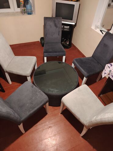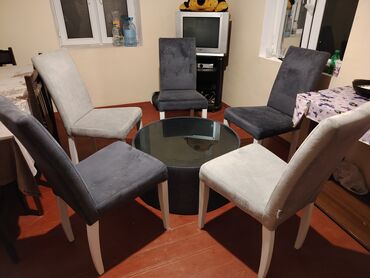 - 6 ədəd yemək otağı stulu: 3 ədəd tünd boz, 3 ədəd açıq boz rəngdə. Ağ rəngli möhkəm ayaqlar, yumşaq oturacaq və hündür arxa hissə. Parça üzlüklə.