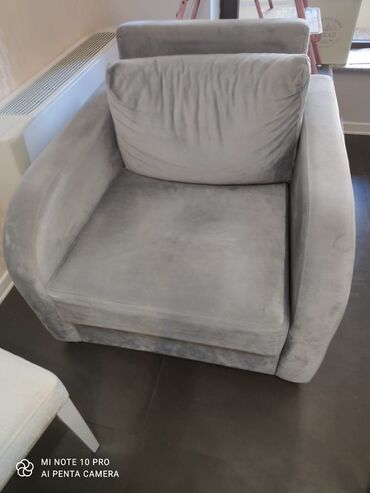 - Yumşaq fotel: Boz rəngli, geniş oturacaq və arxalıq yastığı ilə rahat model. Qalın, yumşaq süet/velür tipli parça, enli qol dayaqları, sabit karkas. Müasir minimal dizayn, istirahət zonası və ya qonaq otağı üçün uyğundur.
