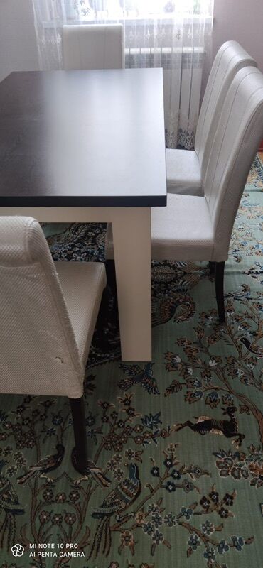 - Yemək masası 1: İki rəngli (tünd üst səth, açıq rəng ayaqlar). Düzbucaqlı forma, qalın stolüstü, möhkəm dördayaqlı konstruksiya. Ağ-krem tonlarında, yumşaq oturacaqlı 4 stul ilə göstərilib. Klassik və modern interyerlərlə uyğunlaşır.