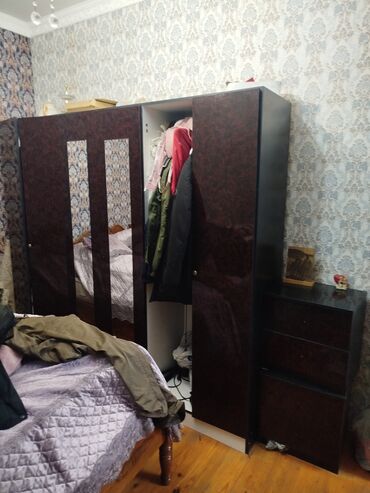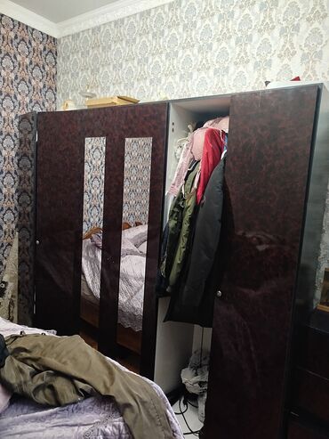 Satılır: ev mebelləri dəsti - Üçqapılı paltar dolabı: klassik dizayn, tünd taxta rəngində, cilalı səth. Mərkəzdə asılqan bölməsi, yanlarda rəf və bölmələr. Qapılarda relyefli çərçivələr, kilid yer...