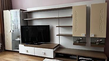 Qonaq otağı üçün mebel dəsti. Dəstdə televizor üçün yer, kitab və dekorativ əşyalar üçün rəflər, həmçinin qab-qacaq və ya digər əşyaları saxlamaq üçün şkaf var. Mebel dəsti müasir dizaynda, ağ və taxta rənglərin kombinasiyasında hazırlanmışdır. televizor dete aid deyil uzunu 3.50sm hundurluyu 170sm
