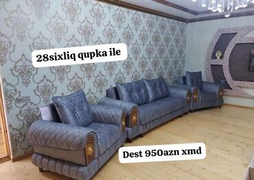 - Açıqlama ilə klassik dəst: 28şıxlıq qupka ilə, Dest 950 AZN xmd. Böyük divan və 2 kreslodan ibarət, dekorativ düymələr və oyma detallar.