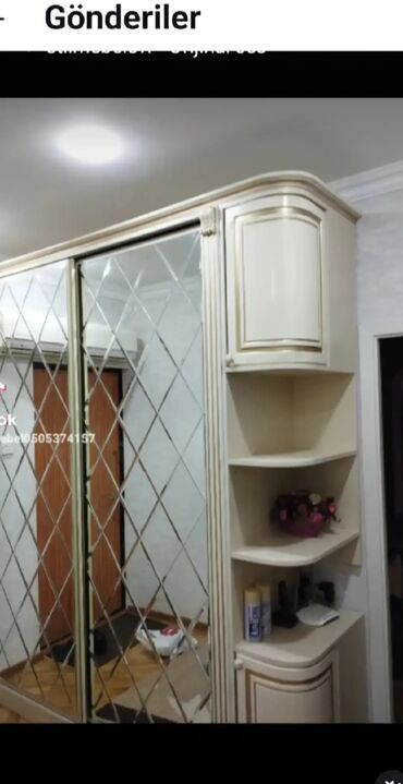 - Sürgülü qapılı, güzgülü və dekorativ fasadlı şkaflar: romb naxışlı güzgü paneli, künc rəflər, qapalı bölmə və asılqanlı geniş iç quruluşu.