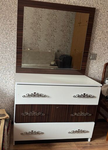 Yataq otağı mebel dəsti Tərkib: - İkinişəlik yataq çərçivəsi (başlıq və ayaqlıqla) - 2 ədəd çarpayı yanı tumba - Geniş güzgülü komod (3 böyük siyirmə) Dizayn və material: - Rəng: ağ və qəhvəyi ik...