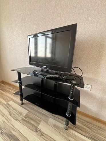 - TV + stend: Samsung düz ekran televizor. Qara şüşə səthli, çoxmərtəbəli TV stendi (3 rəf), metal sütunlu konstruksiya, pult və kabel üçün rahat yerləşdirmə imkanı.