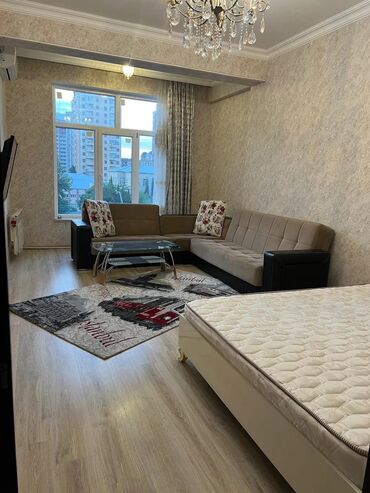 Şəhər mənzərəli pəncərələr, sakit rəng palitrası və müasir dizayn. Mebel və əsas məişət texnikası ilə yaşayışa hazır.