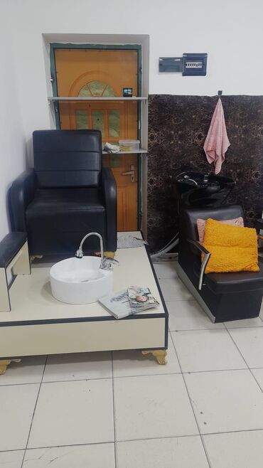 Gözəllik salonu üçün mebel dəsti Tərkib: - Saç yuma stolu: qara rəngli keramika kasa, qarışdırıcı/çuşka kranı, su giriş-çıxış hortumları hazır şəkildə. Yumşaq döşənmiş, erqonomik oturacaq və qol d...