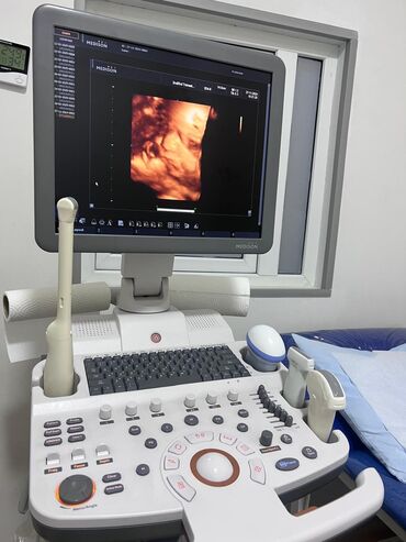 - Transabdominal, transvaginal və lineer problu dəstəkləyir (şəkildə bir neçə prob yuvası görünür)