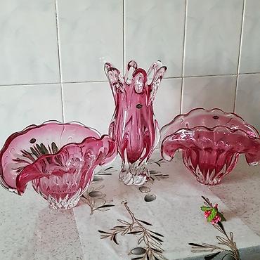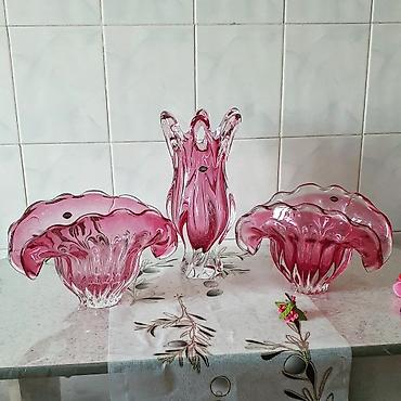 Kəsmə naxışlı şüşə dəst: - 1 ədəd hündür vaza – qalın, şəffaf şüşədən, klassik “ulduz” və “rom” ornamentləri ilə dərin kəsmə işləmələri. Yuxarı kənarı dalğalı formadadır, dekorativ və çiçəklər üçün...