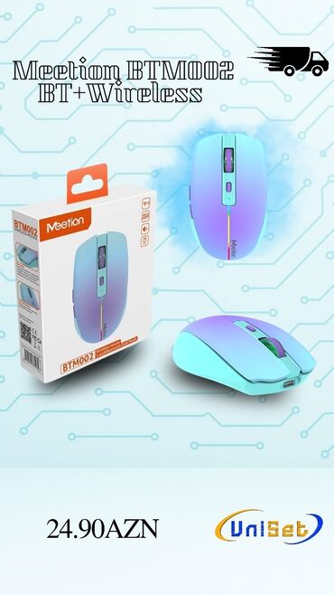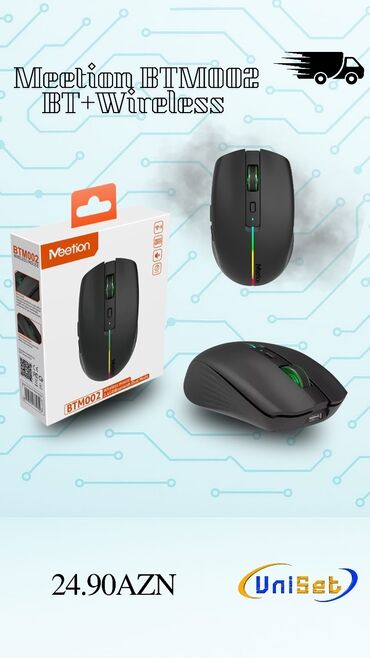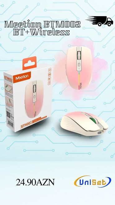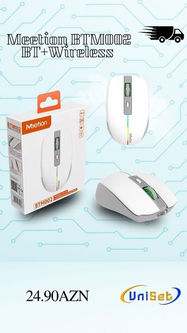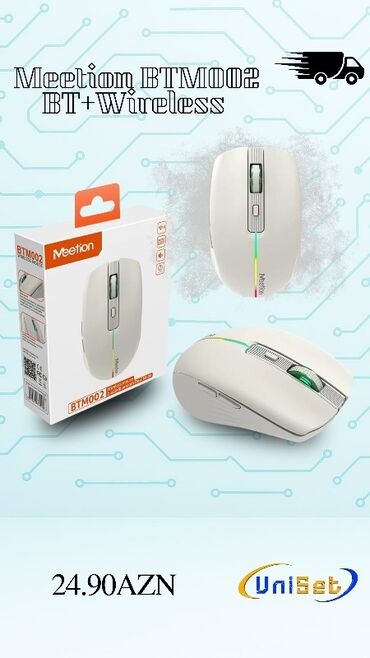 Meetion BTM002 modeli siçan həm Bluetooth, həm də simsiz (2.4GHz) qoşulma seçimləri ilə təchiz olunub, bu da onu müxtəlif cihazlarla istifadə üçün çevik edir. Yığcam və rahat dizaynı ilə uzun müddətli istifadə zamanı rahatlıq təmin edir. Daxili rəngli işıqlandırma siçana müasir görünüş bəxş edir. Bu siçan iş və ya gündəlik istifadə üçün etibarlı bir seçimdir.