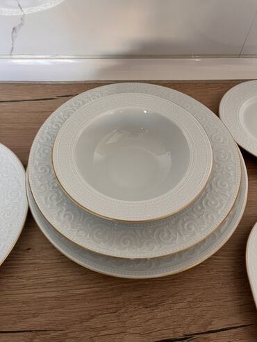 Zərif naxışlı, kənarları qızılı detallı ağ porselen süfrə dəsti. Dəst tərkibi (təxmini saylar şəkillərə əsasən): - Yastı yemək boşqabları (6eded) - Dərin yemək boşqabları 6/şorba qabları6 - Salat ...