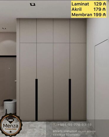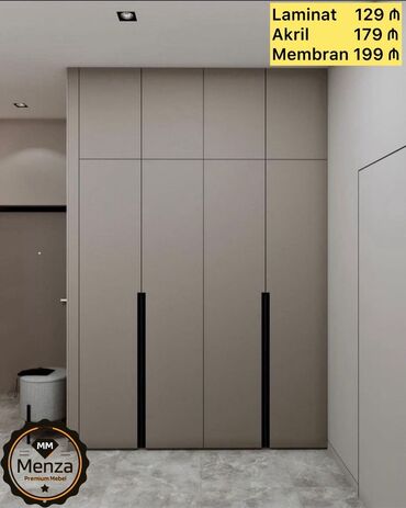 Menza Premium Mebel – sifarişlə quraşdırılan dolab - Material seçimləri və kv.m üzrə göstərilən qiymətlər: • Laminat – 129 AZN • Akril – 179 AZN • Membran – 200 AZN Xüsusiyyətlər: - Tav...