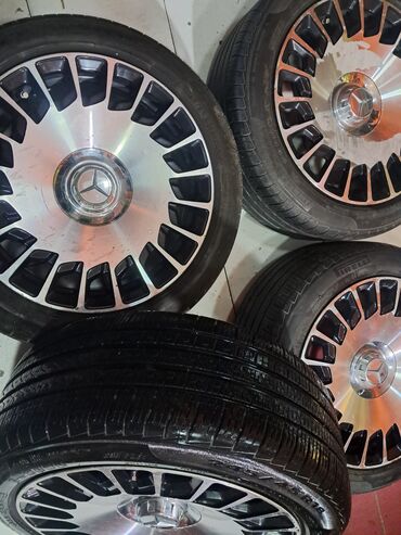 4 ədəd yığılmış disk və şin komplekti - Disklər: çoxşaxəli, çoxlu şüalı dizayn, qara rəng üzərində gümüş konturlar; mərkəzdə Mercedes üslublu qapaqlar. 5 boltlu (5x112 ehtimalı), konus oturacaqlı....