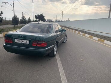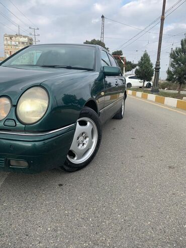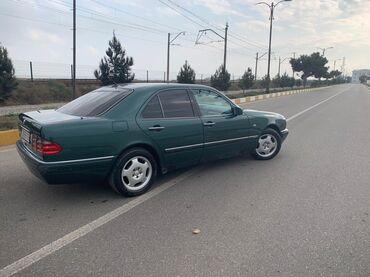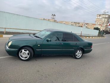 Mercedes-Benz E-Class sedan (W210) – tünd yaşıl rəngdə, klassik “dördgöz” dizayn.
