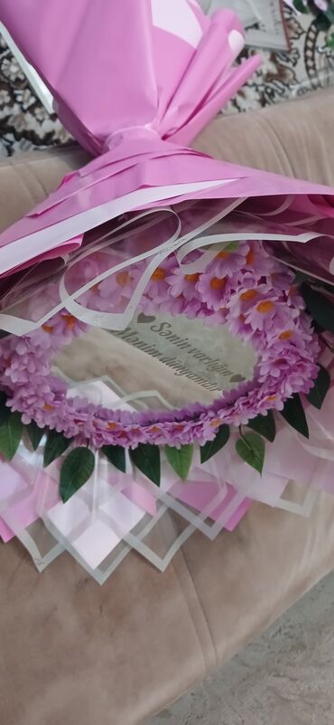 - Dizayn: Şəffaf dairəvi panelin kənarı bənövşəyi/çəhrayı papatyalar və yaşıl yarpaqlarla bəzədilib. Mərkəzdə yazı: “Sənin varlığın mənim dünyamdır”.