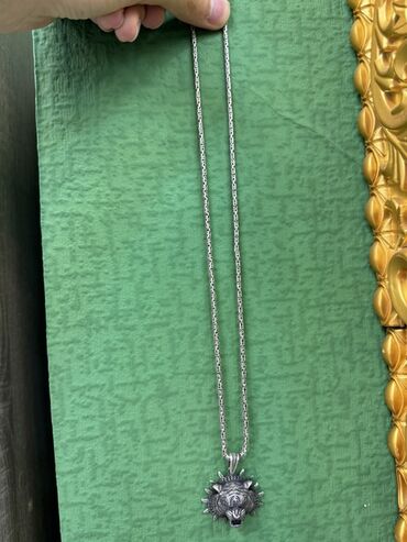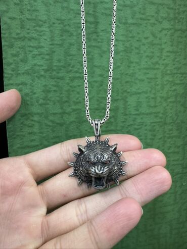 Boz qurd motivli asma boyunbağı - Material: metal zəncir və metal örtüklü asma hissə, diş/sağanaq formalı ağ asma - Dizayn: asma hissə üzərində detallı “qurd başı” və pəncə naxışları; diş formalı ...Giriş•Qeydiyyat