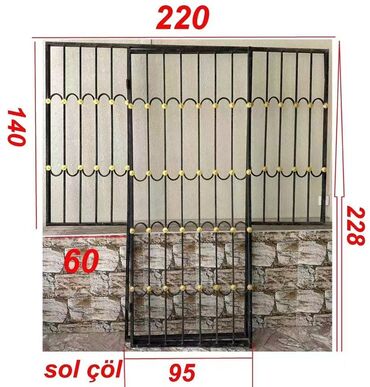 - Dəmir çərçivəli barmaqlıq paneli: Ümumi eni 220 sm. Sol tərəf hündürlük 140 sm, aşağı hissə 60 sm; mərkəzdə qapı hissəsi 95 sm enində, ümumi hündürlük 228 sm. Şaquli millər, dekorativ qövs elementləri və qızılı bəzək başlıqları ilə.
