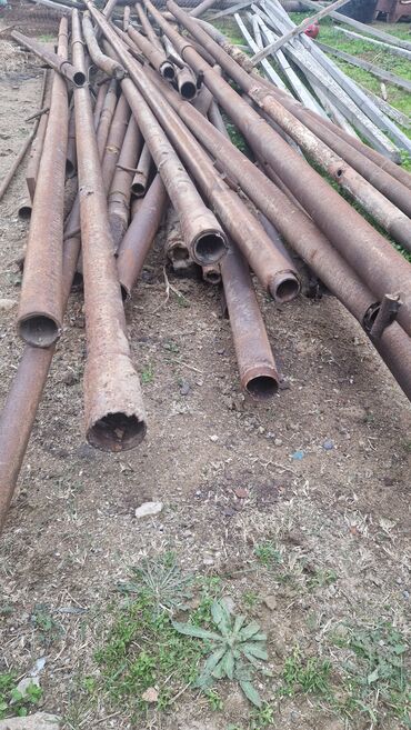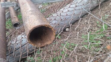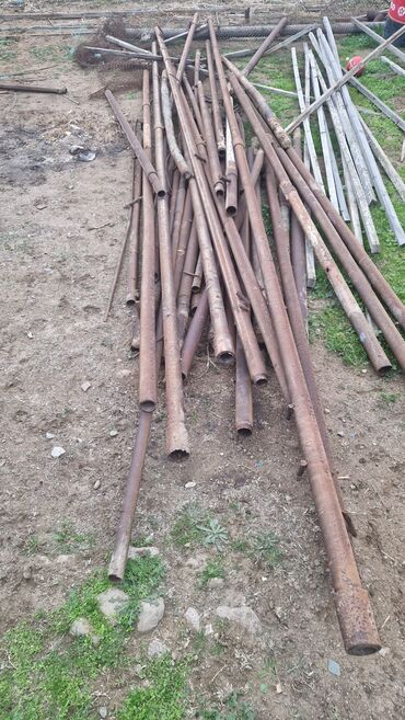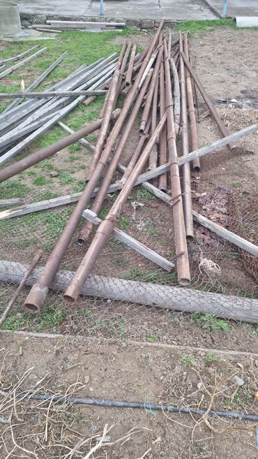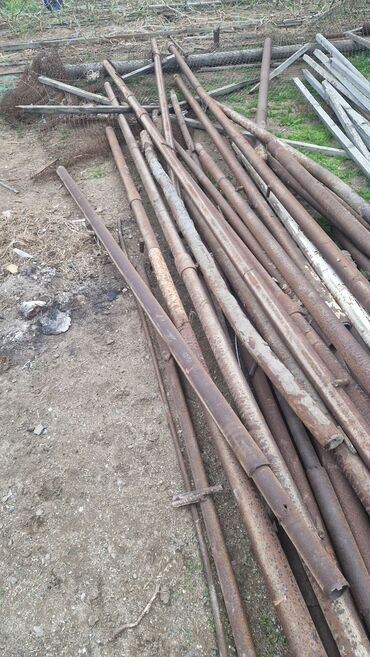 - Çapları müxtəlif olan dairəvi metal borular (təxminən orta diametr: 6–10 sm aralığında; uzunluqlar fərqlidir). Boruların bəzilərində köhnə qaynaq yerləri və kənarlarında bərkidici dilçəklər var, hasar dirəyi kimi istifadə edilib.
