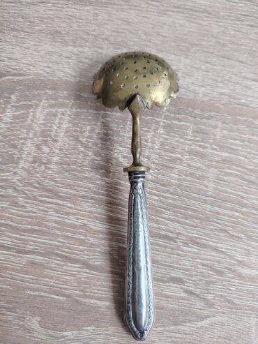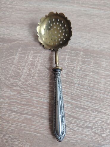Metall çay süzgəci qaşıq - Material: qumush 800 əyar və latun - Forma: yarpaqvari kənarlı, yarımkürə kasalı, çoxsaylı kiçik deşiklərlə. - İstifadə: çay dəmləyərkən yarpaqları saxlayıb, mayeni süz...