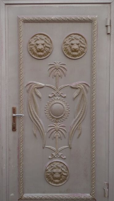 - Ayrı giriş qapısı: relyefli naxışlı panel (palma, günəş, şir medalyonları), çərçivə boyunca dekorativ bordür, metal tutacaq və mexaniki kilid üçün yuva.