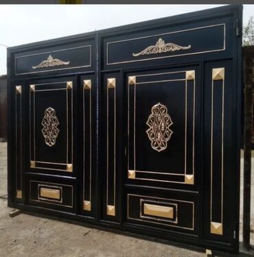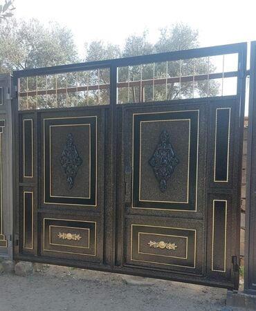 Metal darvaza – dekorativ qızılı naxışlarla - Qapı qaraj və ya həyət girişləri üçündü. - Ölçü: genişlik 2.60 m, hündürlük 2.30m Klassik üslubda, möhkəm və dekorativ görünüşlü giriş həlli.