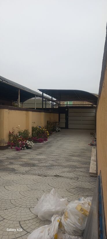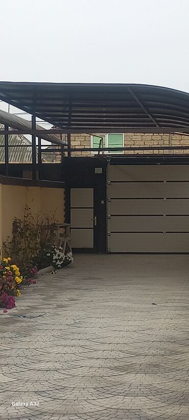 Metal karkaslı dayanacaqlıq kölgəlik və avtomatik qaraj qapısı - Geniş həyət üçün nəzərdə tutulmuş metal konstruksiyalı kölgəlik (avtotəmir/parkinq üstü). Yarımtağ dam forması, möhkəm sütunlar, ya...