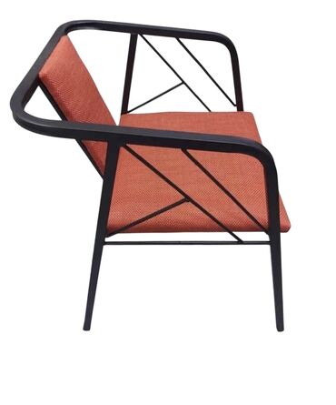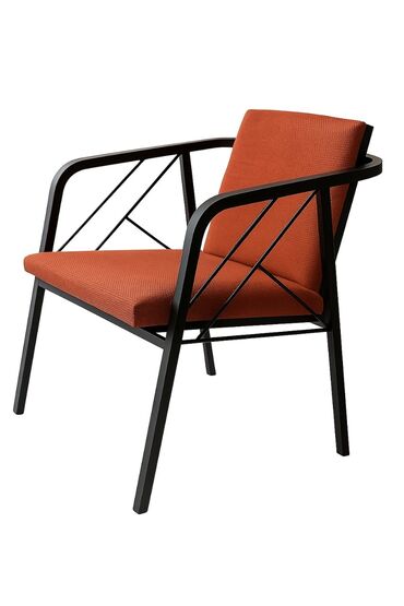 Məhsul: Metal karkaslı, yumşaq oturacaqlı qoltuq/stul - Dizayn: Minimalist və müasir üslub. Qara metal çərçivə, yan hissələrdə dekorativ diaqonal traverslər. Yumru xətli qol dayaqları vizual olara...