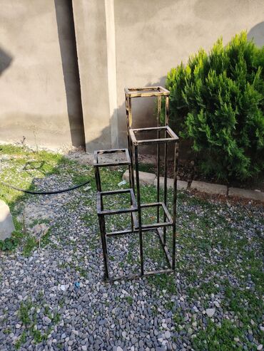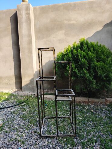 - Dekorativ metal stendlər/kontur karkaslar: kvadrat profildən qayrılmış, müxtəlif hündürlüklərdə modullar. Bitkilər, dekor, qab-qacaq və ya sərgi üçün ekspozisiya stendləri kimi istifadə oluna bilər. Açıq çərçivə forması interyer və eyvan-bağ mühitinə uyğun gəlir.