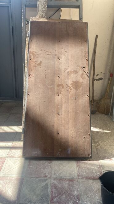 - Ağırlığa tab gətirən metal karkaslı giriş qapısı (iki tərəfli çərçivə, möhkəm eninə bərkidicilər, quraşdırma üçün hazır menteşe və kilid yuvaları). Xaric tərəfi sink/boz metal vərəq, iç tərəfi taxta/kontrplak örtüklə tamamlanıb.