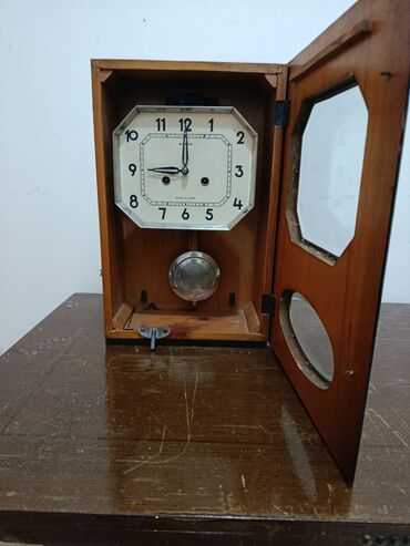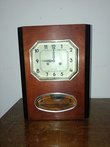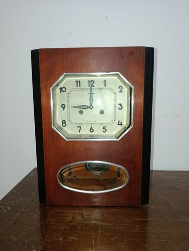Məhsul: Divar saatı (mekanik, pendulumlu) Təsvir: - Klassik taxta korpuslu, şüşə önlü divar saatı - Ağ rəngli səth, iri oxu və rəqəmlərlə asan oxunan siferblat - Siferblatın üzərində “Сделано в СС...