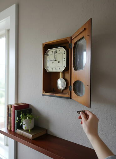 Bu, taxta korpuslu və klassik üslublu divar saatıdır. Saatın ağ rəngli siferblatında böyük, oxunaqlı rəqəmlər və qara saat əqrəbləri var. Aşağı hissədə sarkaç mexanizmi görünür. Bu saat interyerə r...