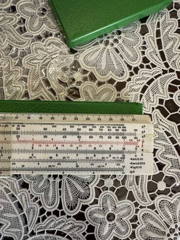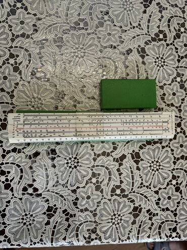 Məhsul: Mexaniki hesablama xətkeşi (slide rule) – orijinal plastik gövdəli, şüşə sürgülü “kurzor”lu model. Üst və alt tərəflərdə çoxsaylı logaritmik şkalalar mövcuddur.
