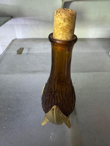 - Şüşə qab: qəhvəyi şüşədən dekorativ flakon, üstü mantar tıxaclı; alt hissəsi teksturalı, metalvari ayaq/detallarla bəzədilib. Ətir, losyon və ya dekor üçün istifadə oluna bilər.