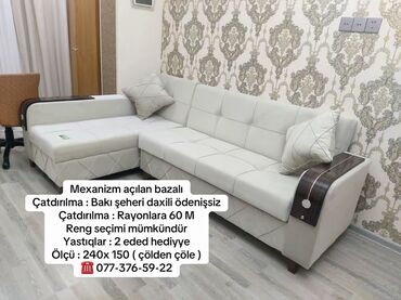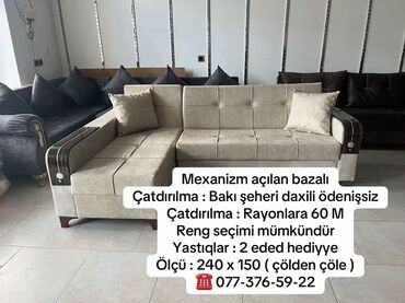 L‑şəkilli yumşaq künc divan - Ölçülər: 240 x 150 sm - Mexanizm: açılan, bazalı (yataq funksiyalı, içi saxlama üçün) - Komplekt: 2 ədəd yastıq hədiyyə - Rəng seçimi: mümkündür - Çatdırılma: şəhər ...