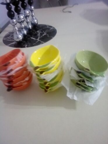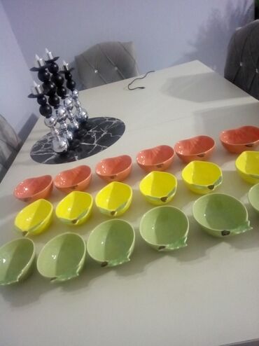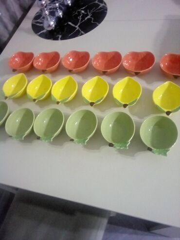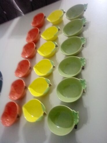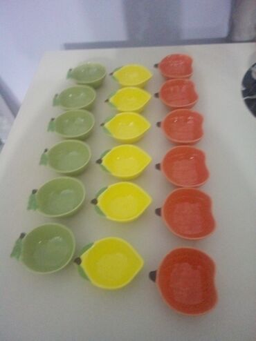 Meyvə formalı xidmət qabları dəsti 18 ededi 12 manat. Dəstə qırmızı alma, sarı limon və yaşıl armud formalı kiçik qablar daxildir. Hər bir qabın özünəməxsus meyvə dizaynı var. Bu qablar qəlyanaltılar, souslar və ya digər kiçik yeməkləri süfrəyə vermək üçün idealdır. Onlar həmçinin mətbəxə rəngarəng və şən bir görünüş qatmaq üçün dekorativ element kimi də istifadə edilə bilər. Dəst müxtəlif rənglərdə və meyvə formalarında olan çoxsaylı qablardan ibarətdir.