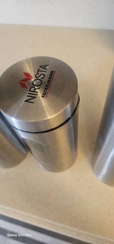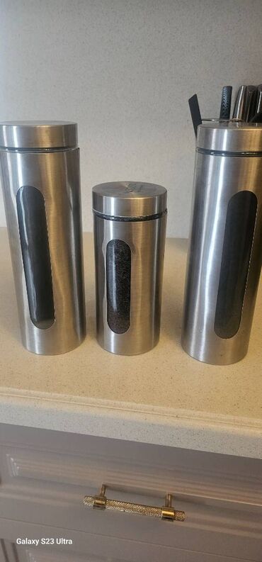 İşlənmişMəhsul: Nirosta by Fackelmann paslanmayan poladdan,ici suse, 3 ədəd mətbəx saxlama qabı dəsti,ela veziyyetde, boyuk olcu 1.800ml,balaca 1.300 ml