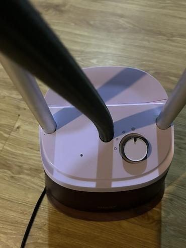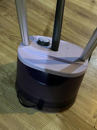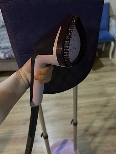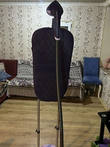 Məhsul: Şaquli buxarlı ütü (geyim steameri) – stansiya, tənzimlənən dirəklər və ütüləmə lövhəsi ilə komplekt.