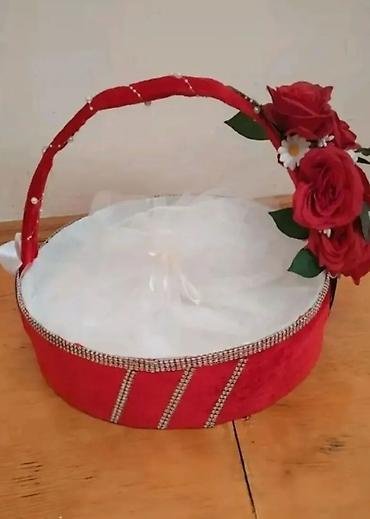 - 1 ədəd dairəvi qırmızı xonça: qırmızı məxmər örtük, incə muncuqlu bəzəklər, tutacaqda süni qızılgül kompozisiyası, ağ tull örtüklü içlik.