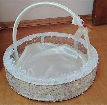 - 1 ədəd dairəvi krem-ağ xonça: atlas içlik, krujeva (qeyri-bərabər naxışlı) kənarlar, krem rəngli tutacaqda lent və bəzək daşı.