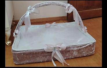 - 1 ədəd düzbucaqlı krem xonça: məxmər kənarlar, qalın tutacaq, kənarlarda dekorativ lentlər və fiyonklər, içlik şəffaf örtüklə.