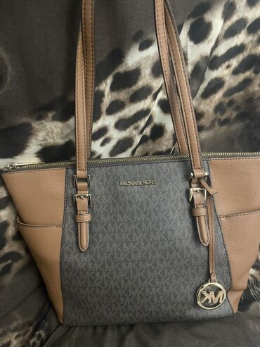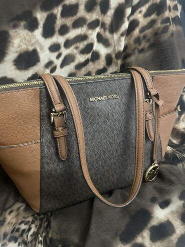 Qadın çantası – MK loqolu baha alinib - Dizayn: Bej rəngli monoqramlı (MK naxışlı) korpus, karamel-qəhvəyi dəri detallar - Materiallar: Möhkəm tekstil və dəri kombinasiyası, qızılı rəngli metal ar...
