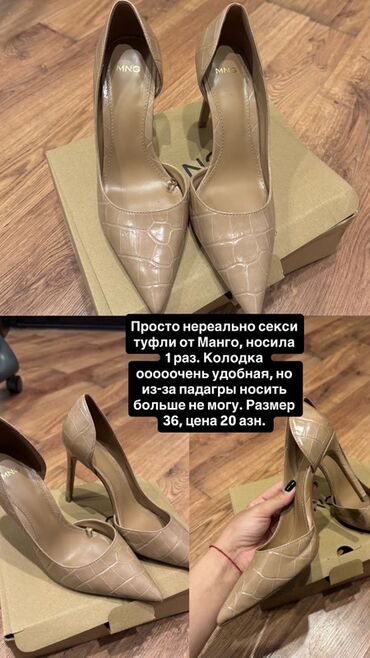 - Mango (MNG) qadın tuflisi. Rəng: bej-nyud, krokodil teksturalı, iti burun, hündür nazik daban. Ölçü: 36. Qiymət: 20 AZN.