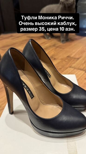 - Monica Ricci qadın tuflisi. Rəng: tünd göy/qara tona yaxın, platformalı, çox hündür daban. Ölçü: 35. Qiymət: 10 AZN.