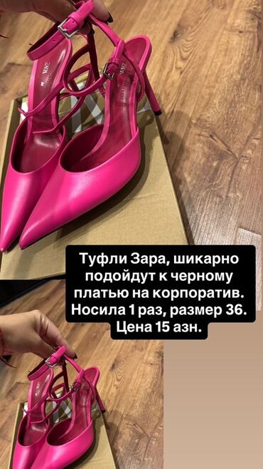 - Zara qadın stilettosu. Rəng: parlaq çəhrayı, nazik tənzimlənən qayışlı, iti burunlu, hündür daban. Ölçü: 36. Qiymət: 15 AZN.