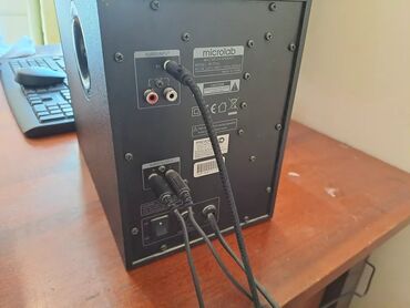- Korpus: taxta subwoofer, parlaq qara ön panel; peyk dinamiklərdə Microlab loqosu