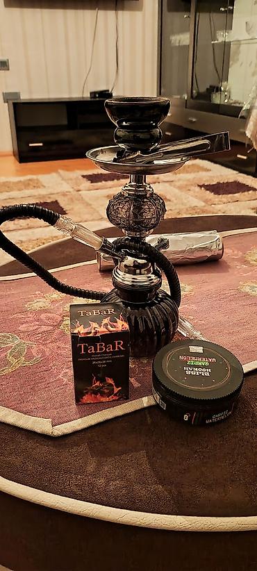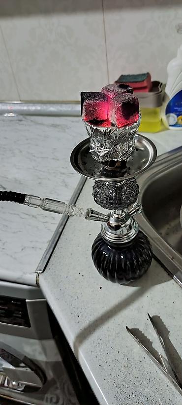 - Kompakt stolüstü nərgilə: şüşə kolba, metal gövdə, keramik kasa, kül qabı və şlanq.