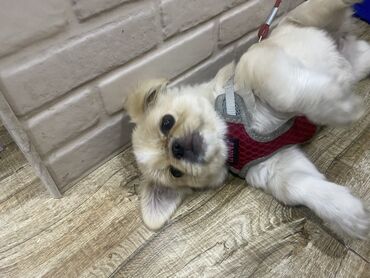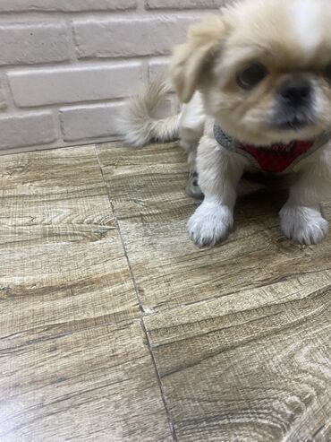 Mini ölçülü it balası – krem rəngli, qısa tüklü, yastı sifət və iri, qara gözlər. Qısa pəncələr, tüklü quyruq, alınında ağ zolaq var. Boynunda parlaq qırmızı tor teksturalı döşləmə (harness) və boğazlıq görünür. Şəhər mənzilləri üçün uyğun kompakt ölçü, sakit və mehriban xarakter göstəriciləri. Gündəlik gəzinti üçün döşləmə ilə rahat idarə olunur. Uşaqlarla hərəkətli oyunlara meylli, diqqəti sevir. Qidalanmada kiçik cinslər üçün quru/yumşaq yem uyğunluq göstərir. Yuyulması və daranması asan olan qısa, yumşaq tüklər. Evdə öyrədilməyə uyğun, pozitiv motivasiya ilə tez öyrənir. İçəridə sakit, qucağı sevən, ailə yoldaşı axtaranlar üçün ideal.